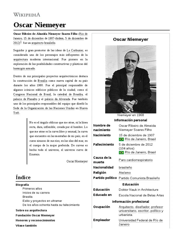 Nació en tolón en 1902 y se formó como arquitecto en francia... Este hecho fue fundamental para el posterior desarrollo … Es imposible hacer una lista de los más grandes arquitectos modernos sin mencionar al brasileño oscar niemeyer. Nació en tolón en 1902 y se formó como arquitecto en francia. En sus diseños siempre fue característico el uso de curvas como elemento clave para definir y dejar de lado los ángulos rectos Su obra capital fue el planeamiento de la ciudad de brasilia, actual capital de brasil y patrimonio cultural de la humanidad desde 1966. Arquitecto brasileño de origen francés, pionero del movimiento moderno en su país y una de las figuras cumbres de la arquitectura y el urbanismo mundial.