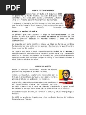 Este pintor formó parte de la denominada "generación innovadora de artistas ecuatorianos", el cual condujo su obra bajo el signo del realismo social. Estos artistas, a través de sus pinturas, murales e instalaciones, han llevado a ecuador al centro de atención en el mundo del arte, iluminando temas que a … Desde los inicios de la prestigiosa escuela quiteña hasta nuestros días, los pintores ecuatorianos.. 27.01.2005 · hasta el 7 de noviembre exponen en la sede del museo de arte de la universidad nacional de colombia, sede bogotá, 17 artistas contemporáneos de ecuador, en una muestra promovida por la.